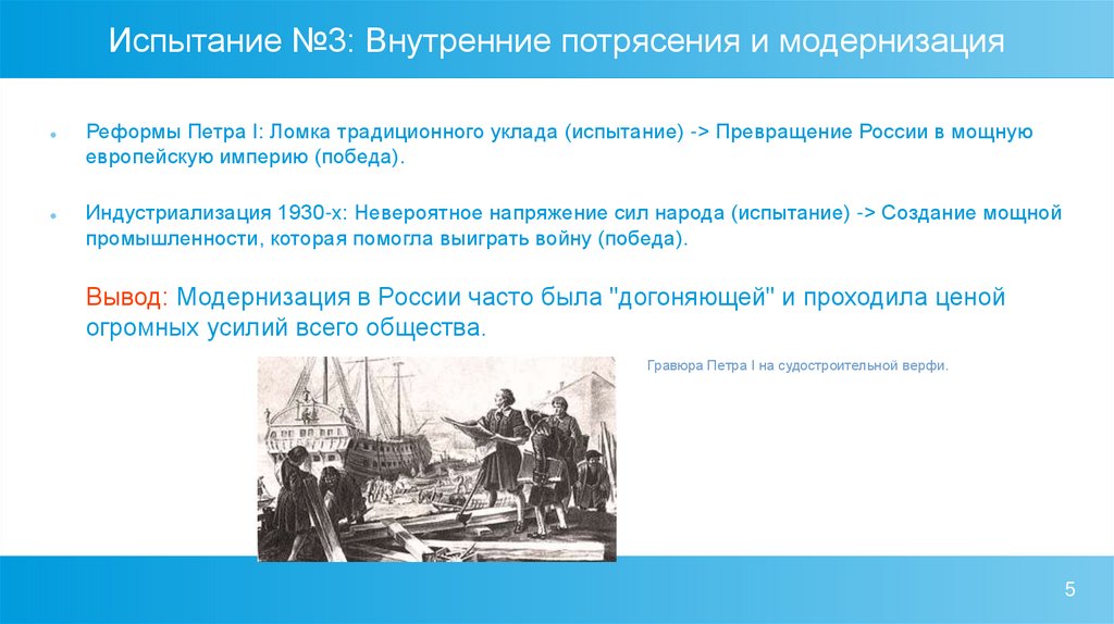 Испытание №3: Внутренние потрясения и модернизацияРеформы Петра I: Ломка традиционного уклада (испытание) -> Превращение России в мощную