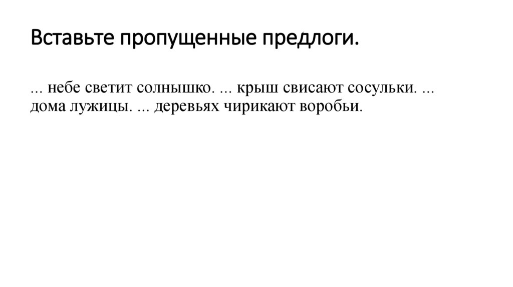 Вставьте пропущенные предлоги.... небе светит солнышко. ... крыш свисают сосульки. ...