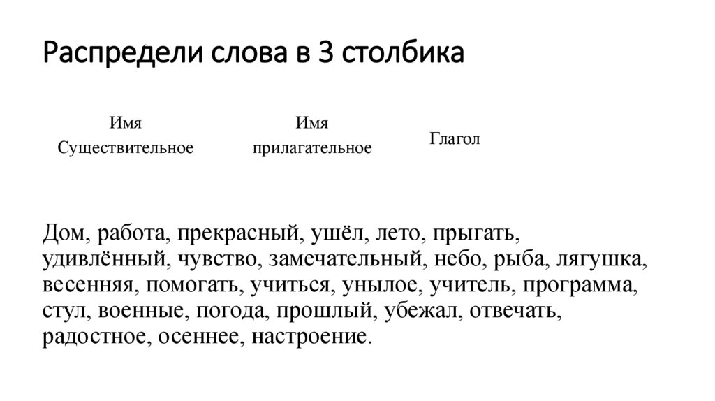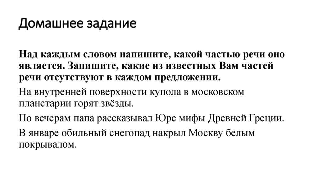 Домашнее заданиеНад каждым словом напишите, какой частью речи оно