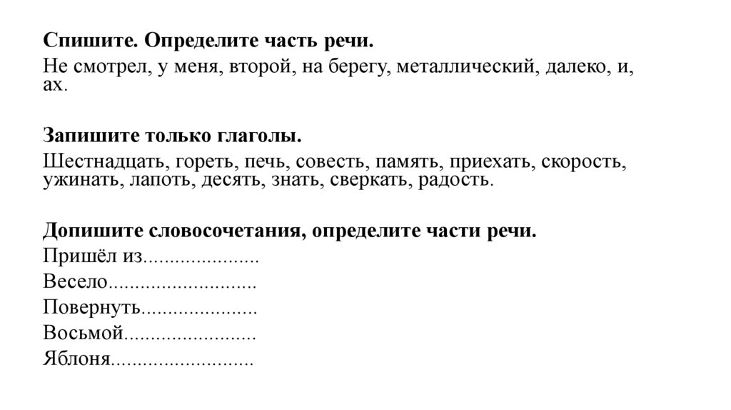 Спишите. Определите часть речи.Не смотрел, у меня, второй, на берегу, металлический, далеко, и,