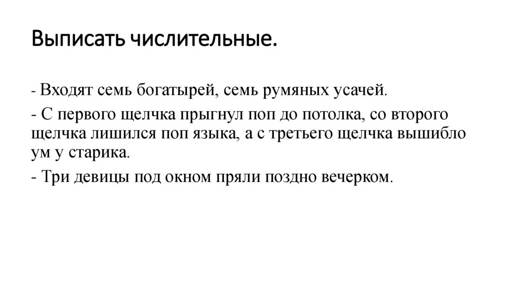 Выписать числительные.- Входят семь богатырей, семь румяных усачей.