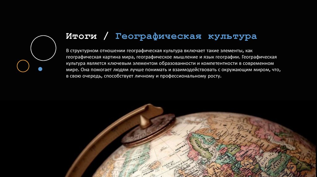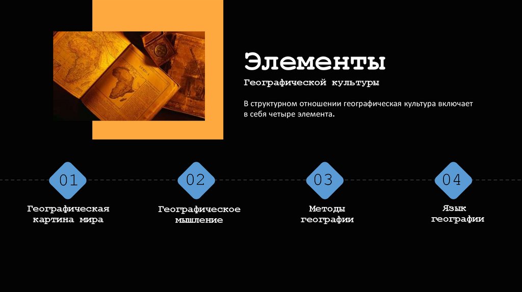 Итоги / Географическая культураВ структурном отношении географическая культура включает такие элементы, как