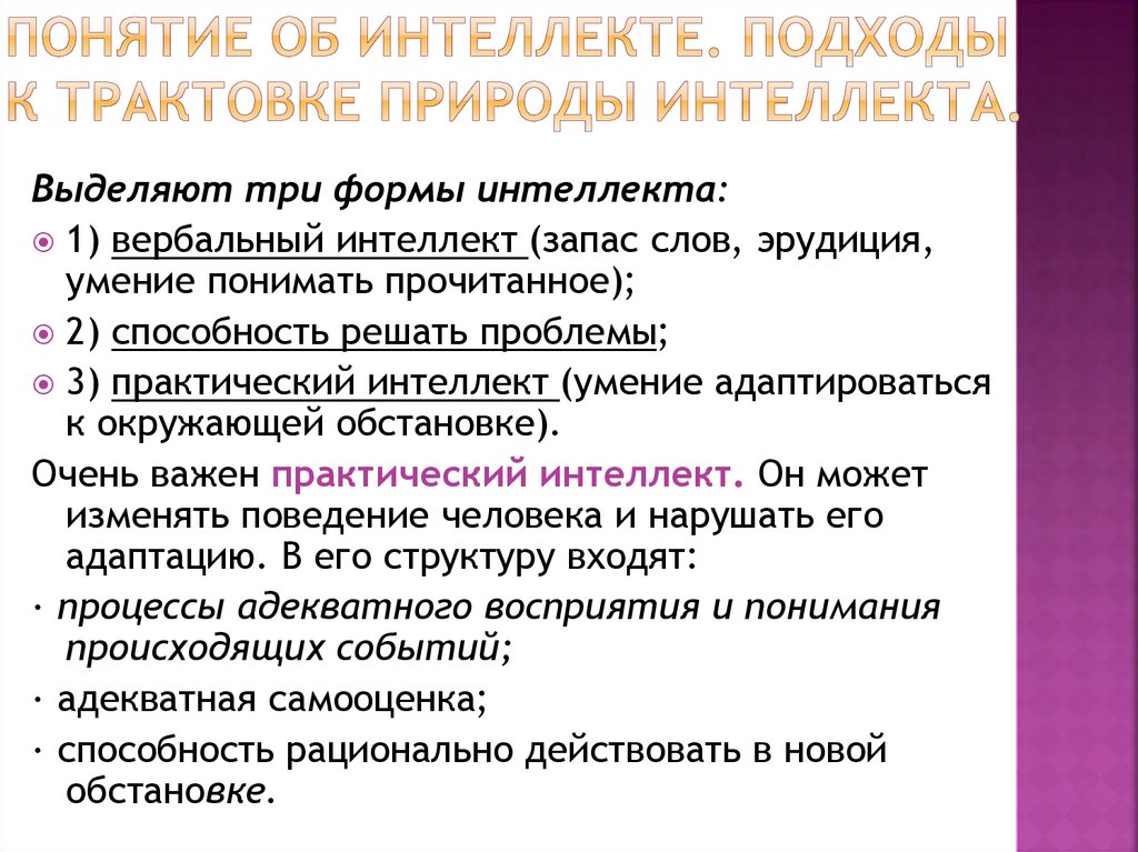 Выделяют три формы интеллекта:1) вербальный интеллект (запас слов, эрудиция,