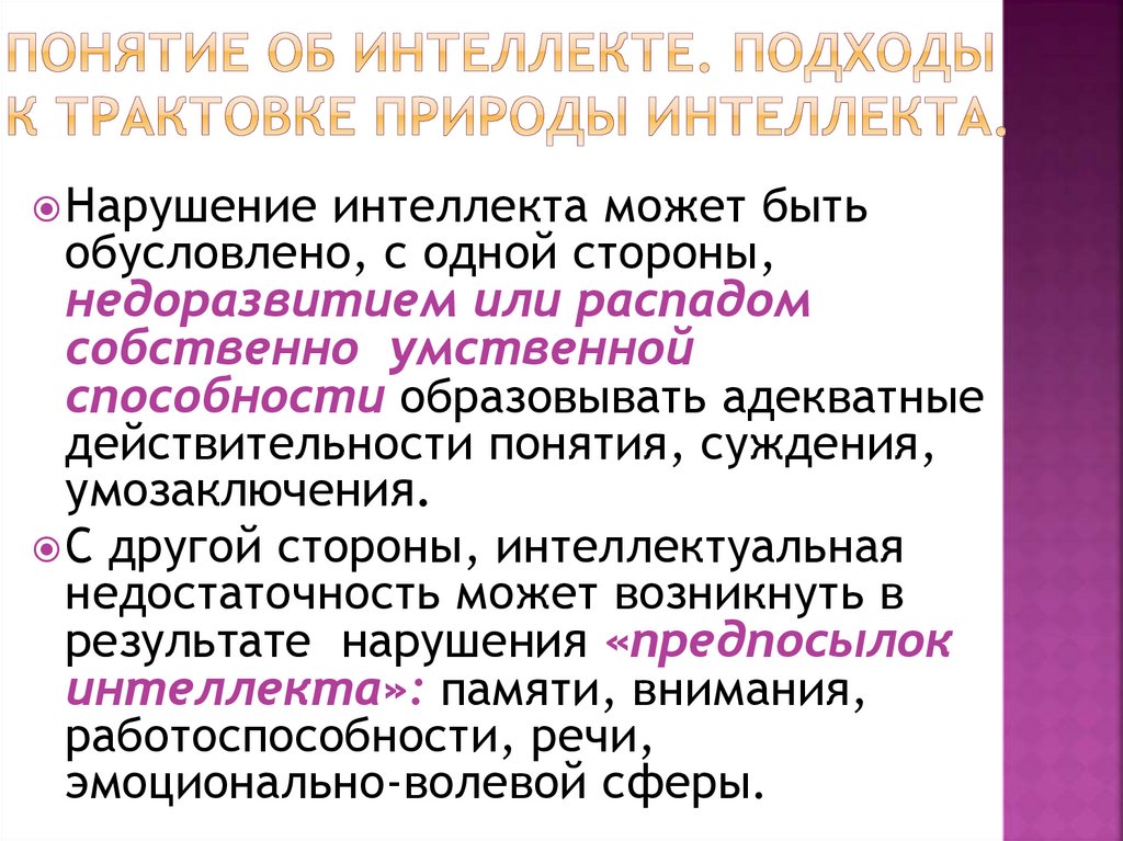 Нарушение интеллекта может бытьобусловлено, с одной стороны,