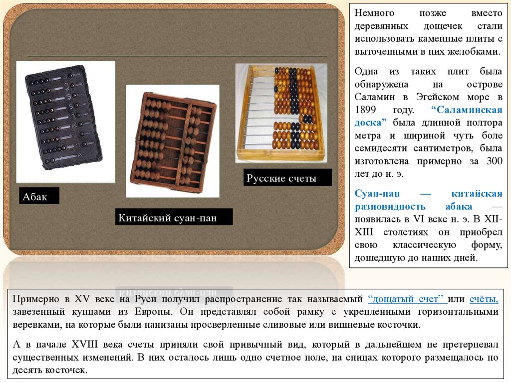 Примерно в XV веке на Руси получил распространение так называемый “дощатый счет” или счёты,