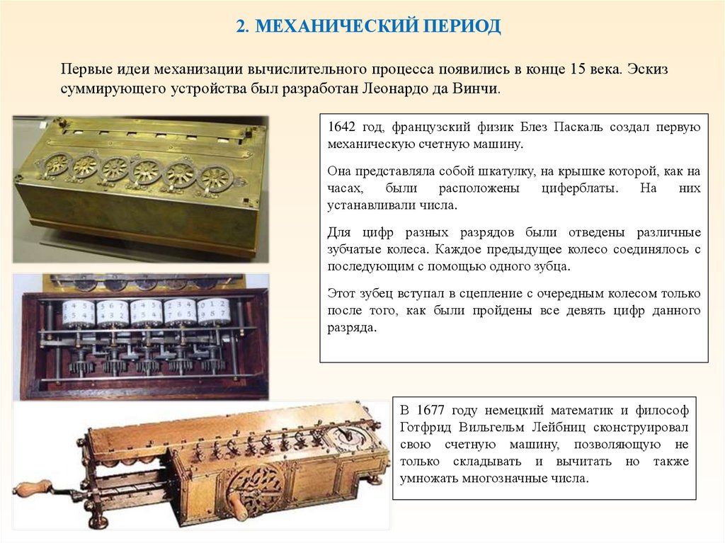 Всю историю вычислительной техники принято делить на три основных этапа:домеханический, механический, электронно-вычислительный.