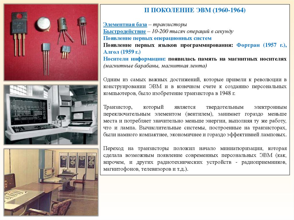 II ПОКОЛЕНИЕ ЭВМ (1960-1964)Элементная база – транзисторы