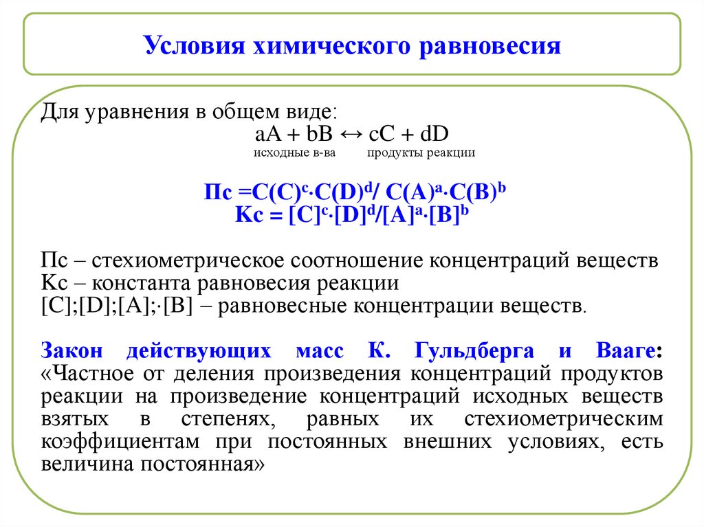Условия химического равновесияДля уравнения в общем виде: