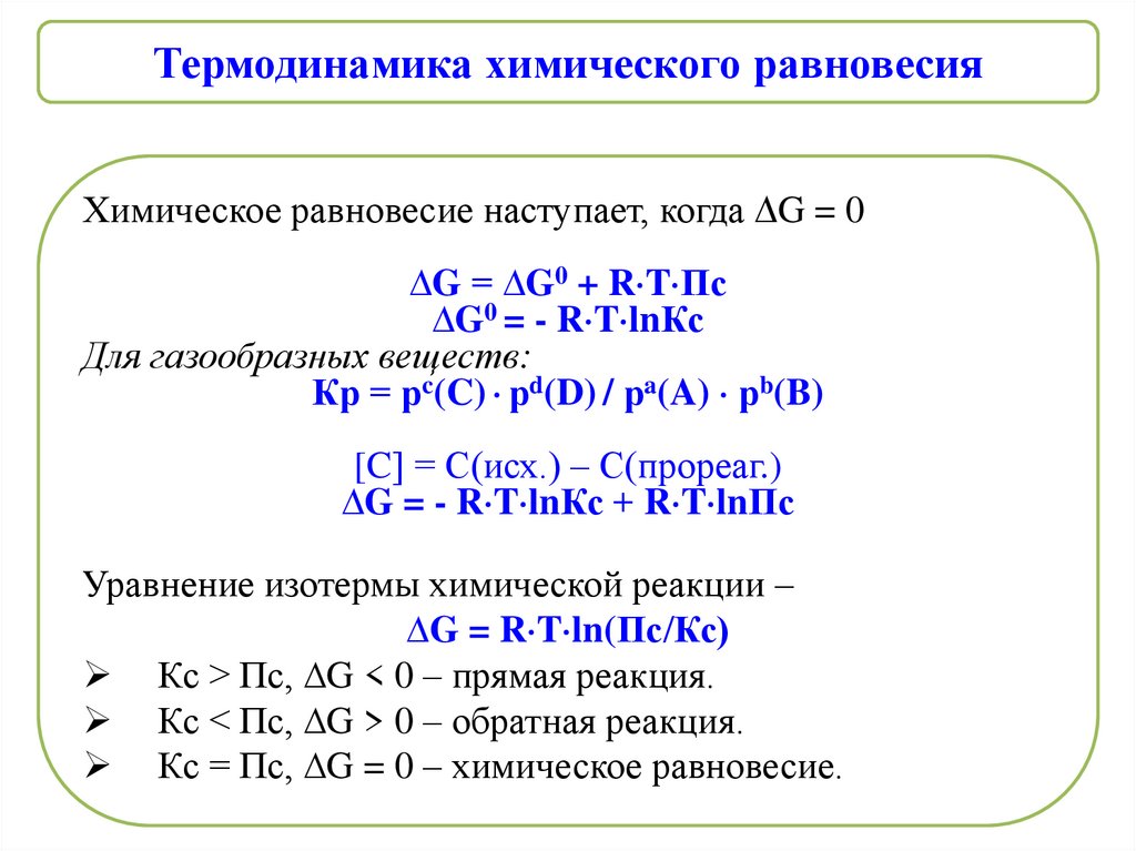 Кс = Пс, ∆G = 0 – химическое равновесие.