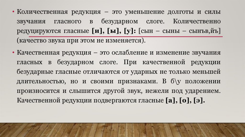 • Количественная редукция – это уменьшение долготы и силызвучания гласного в безударном слоге. Количественно