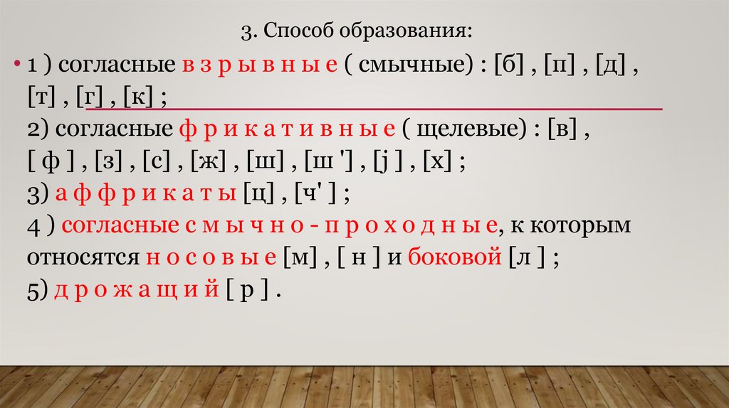 3. Способ образования:• 1 ) согласные в з р ы в н ы е ( смычные) : [б] , [п] , [д] ,