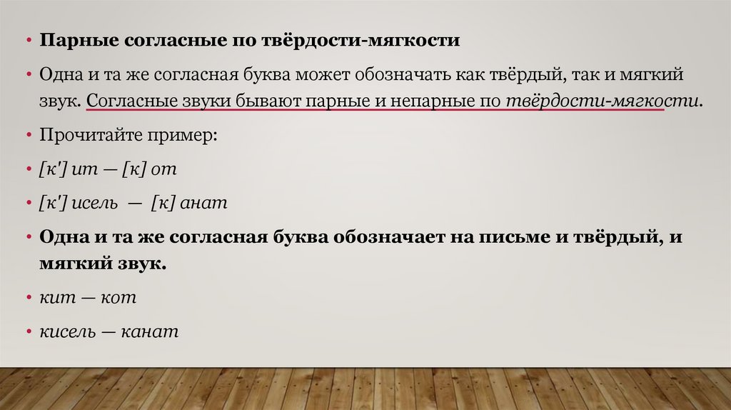 • Парные согласные по твёрдости-мягкости• Одна и та же согласная буква может обозначать как твёрдый, так и мягкий