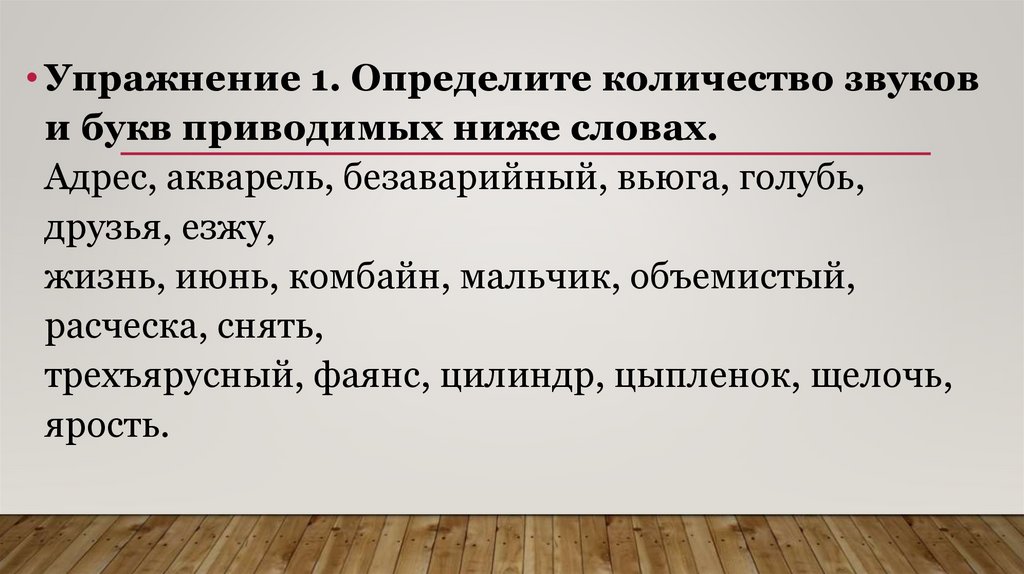 • Упражнение 1. Определите количество звукови букв приводимых ниже словах.