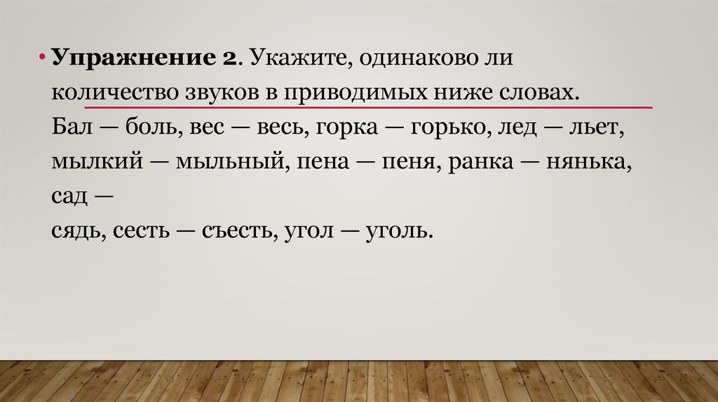 • Упражнение 2. Укажите, одинаково ликоличество звуков в приводимых ниже словах.