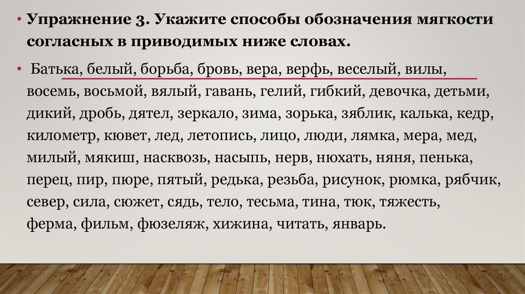 • Упражнение 3. Укажите способы обозначения мягкостисогласных в приводимых ниже словах.
