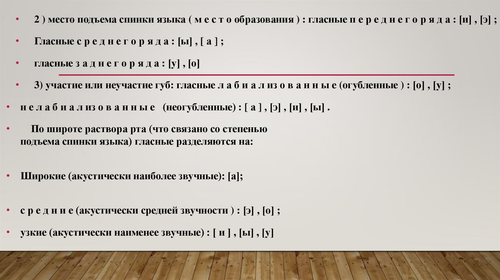2 ) место подъема спинки языка ( м е с т о образования ) : гласные п е р е д н е г о р я д а : [и] , [э] ;