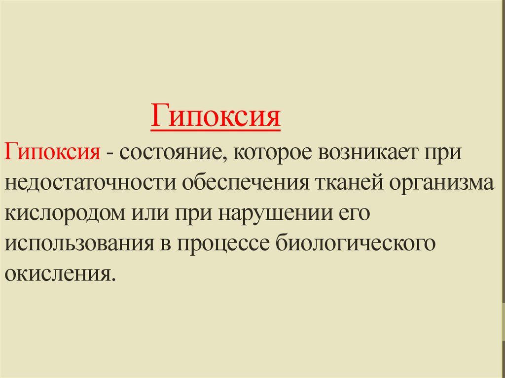 1. Гипоксия Гипоксия - состояние, которое возникает при недостаточности обеспечения тканей организма кислородом или при нарушении