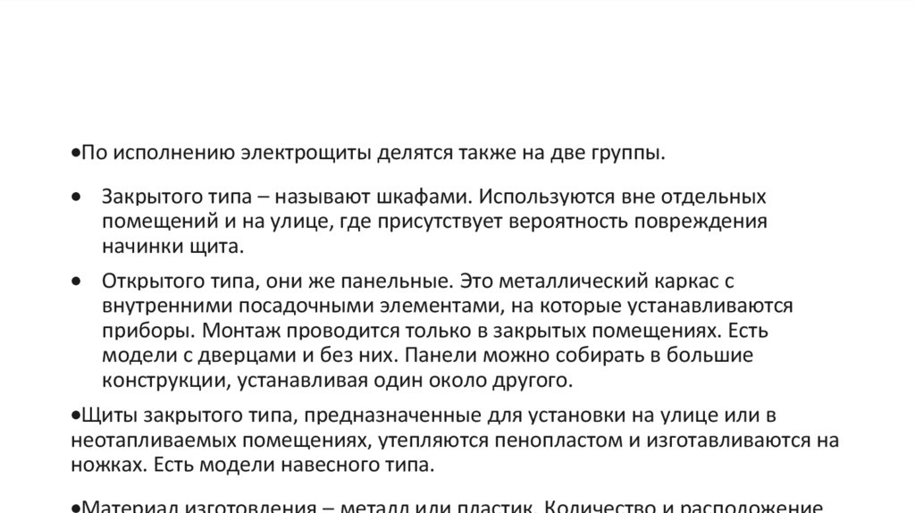 По исполнению электрощиты делятся также на две группы.Закрытого типа – называют шкафами. Используются вне отдельных