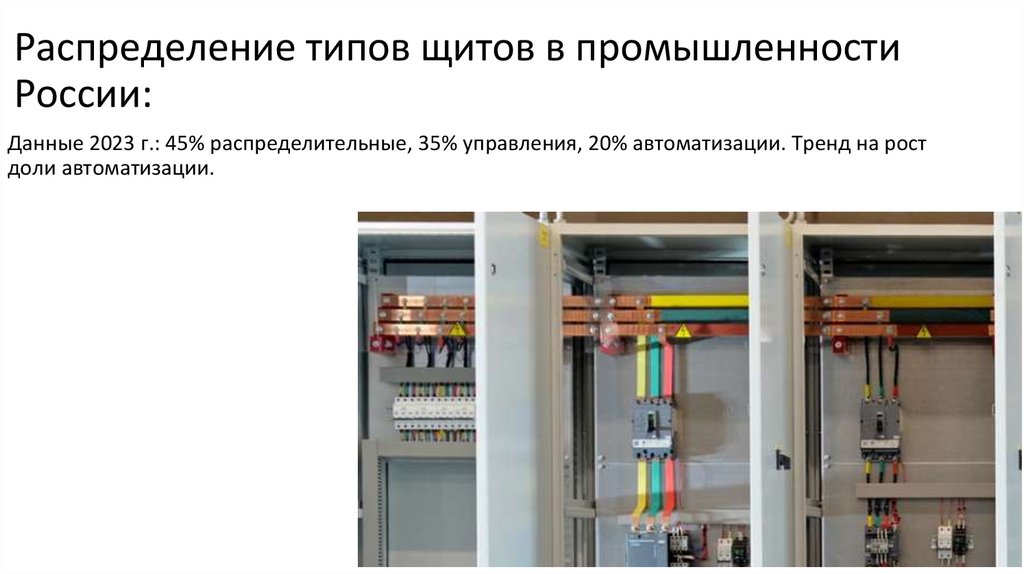Данные 2023 г.: 45% распределительные, 35% управления, 20% автоматизации. Тренд на рост