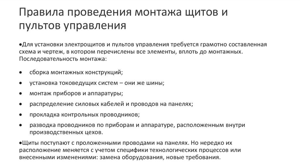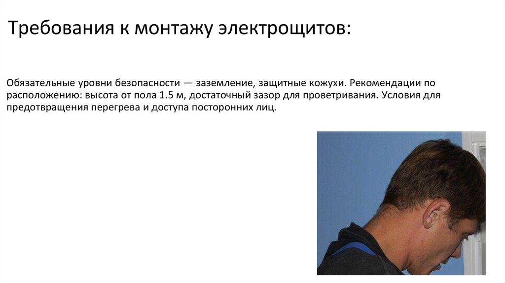 Требования к монтажу электрощитов:Обязательные уровни безопасности — заземление, защитные кожухи. Рекомендации по