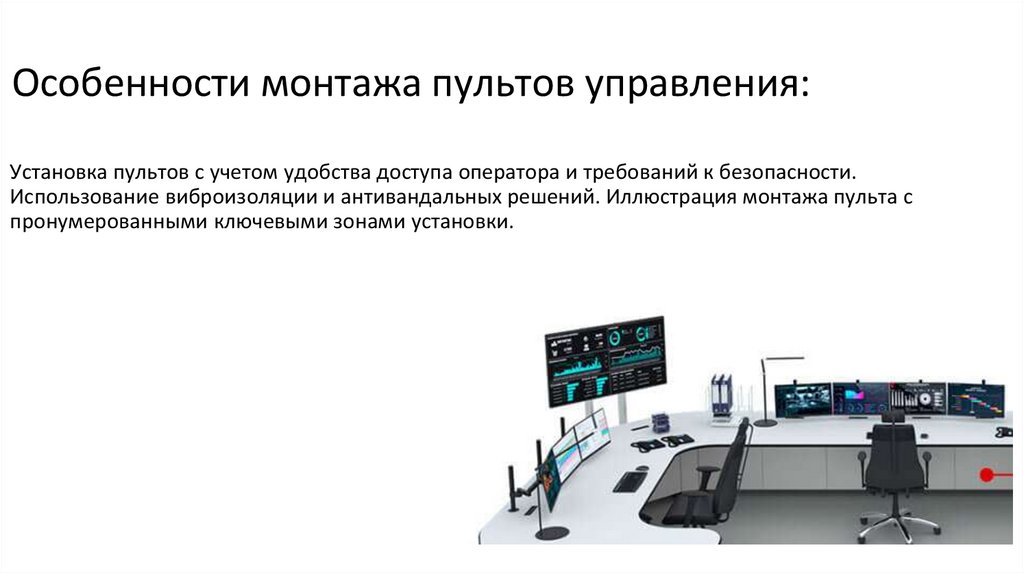 Особенности монтажа пультов управления:Установка пультов с учетом удобства доступа оператора и требований к безопасности.