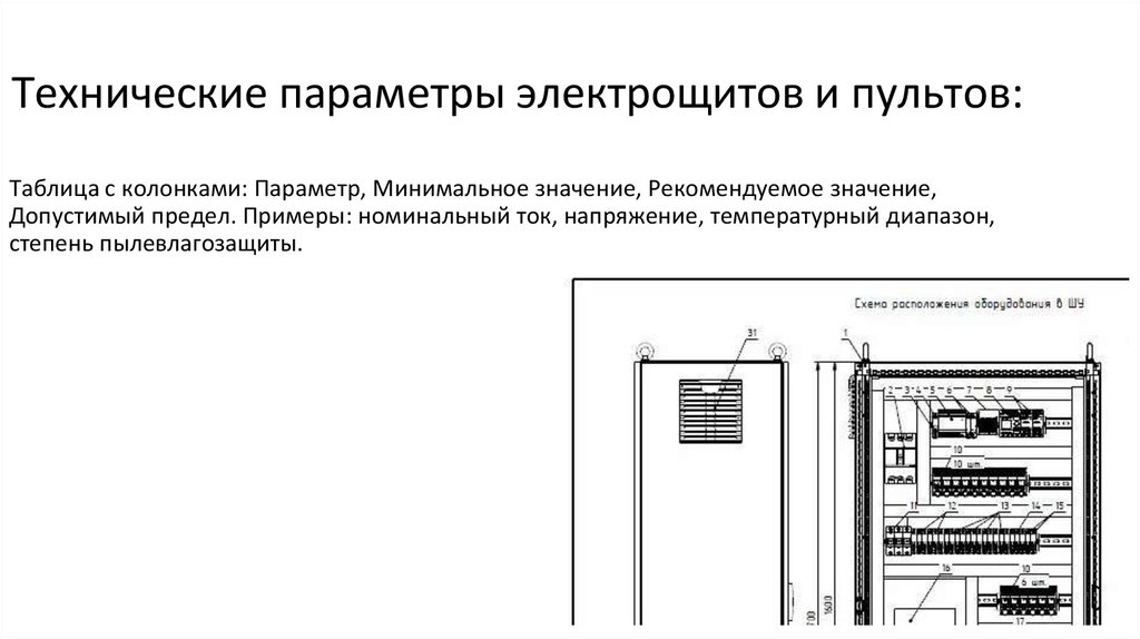 Технические параметры электрощитов и пультов:Таблица с колонками: Параметр, Минимальное значение, Рекомендуемое значение,