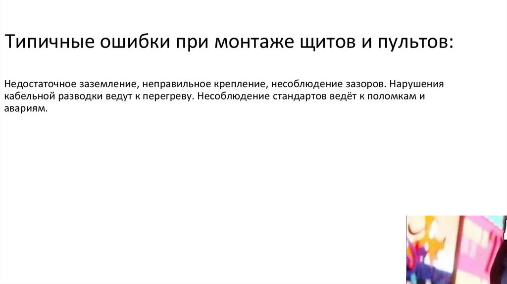 Типичные ошибки при монтаже щитов и пультов:Недостаточное заземление, неправильное крепление, несоблюдение зазоров. Нарушения