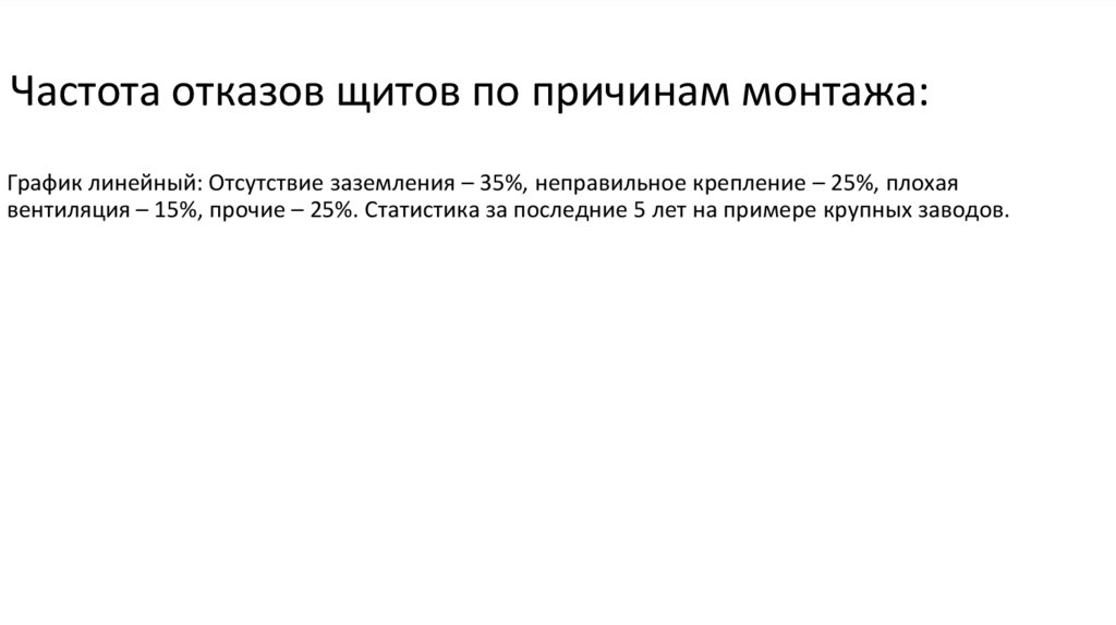 Частота отказов щитов по причинам монтажа:График линейный: Отсутствие заземления – 35%, неправильное крепление – 25%, плохая