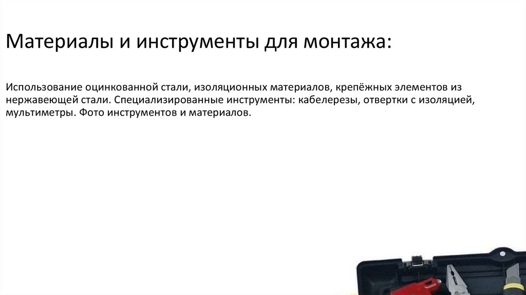 нержавеющей стали. Специализированные инструменты: кабелерезы, отвертки с изоляцией,