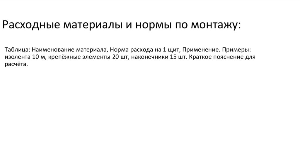 Расходные материалы и нормы по монтажу:Таблица: Наименование материала, Норма расхода на 1 щит, Применение. Примеры: