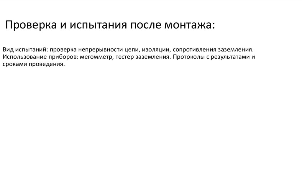 Проверка и испытания после монтажа:Вид испытаний: проверка непрерывности цепи, изоляции, сопротивления заземления.