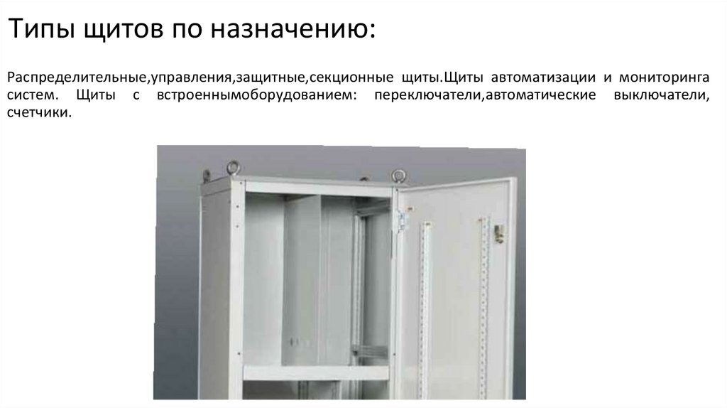 Типы щитов по назначению:Распределительные,управления,защитные,секционные щиты.Щиты автоматизации и мониторинга