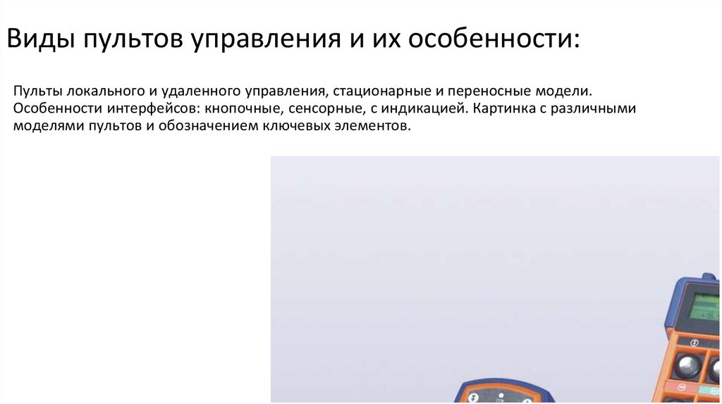 Виды пультов управления и их особенности:Пульты локального и удаленного управления, стационарные и переносные модели.