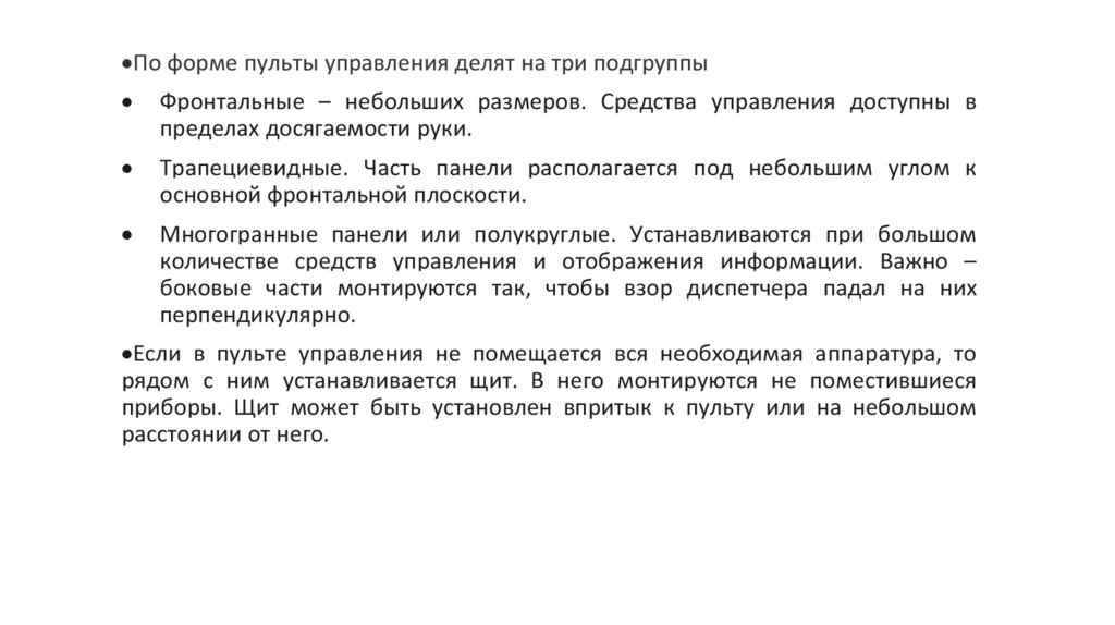 По форме пульты управления делят на три подгруппыФронтальные – небольших размеров. Средства управления доступны в