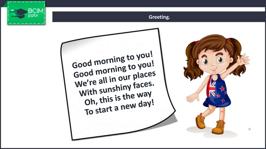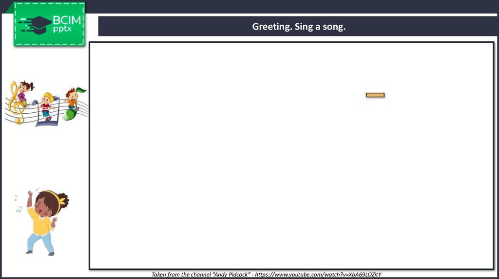Greeting. Sing a song.Taken from the channel “Andy Pidcock” - https://www.youtube.com/watch?v=XbA69LOZjtY