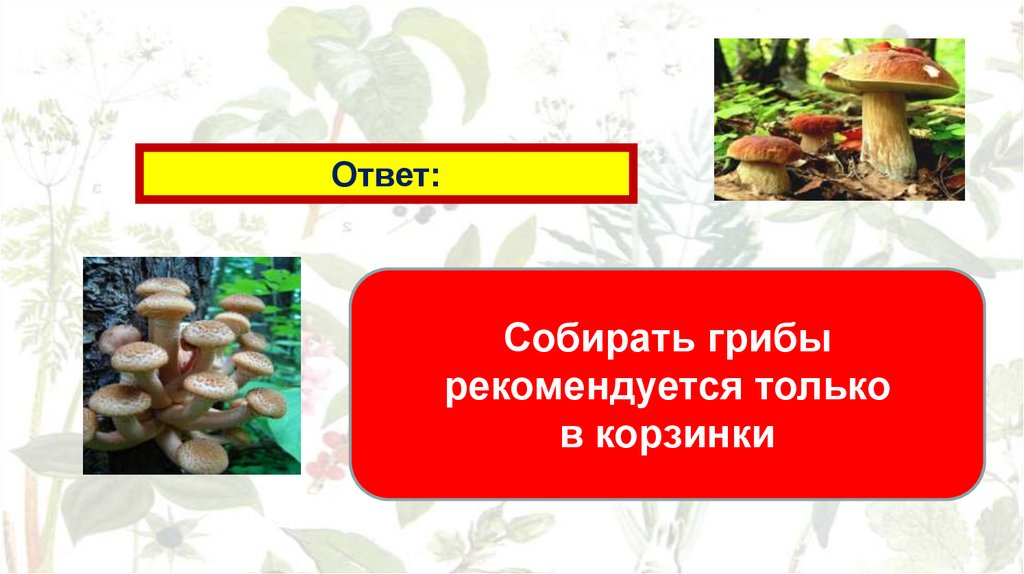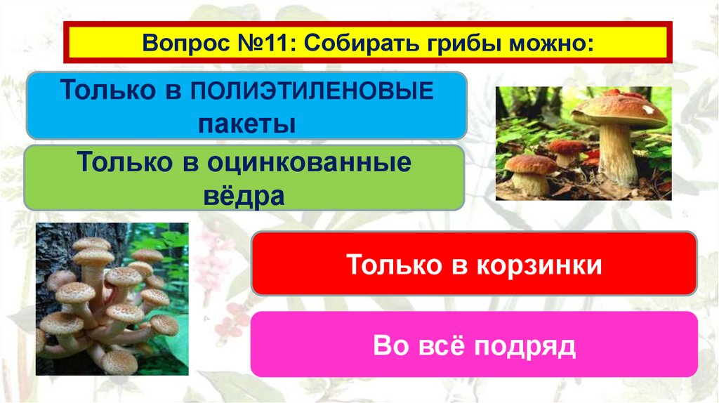 Вопрос №11: Собирать грибы можно:Только в ПОЛИЭТИЛЕНОВЫЕ
