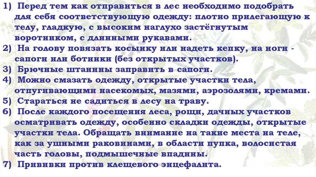 1) Перед тем как отправиться в лес необходимо подобратьдля себя соответствующую одежду: плотно прилегающую к