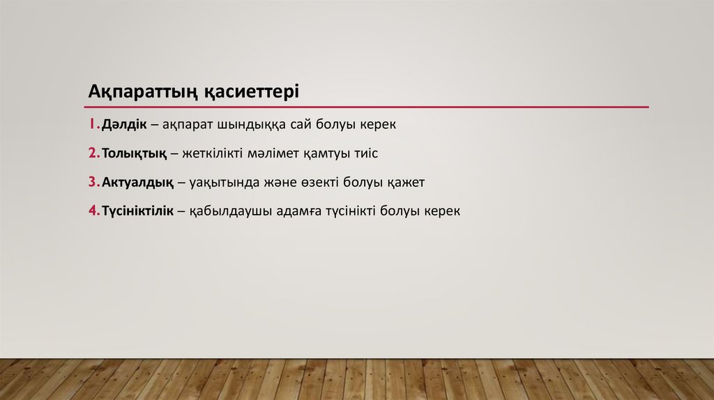 Ақпараттың қасиеттері1.Дәлдік – ақпарат шындыққа сай болуы керек