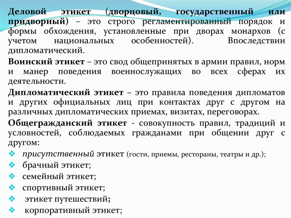 ❖ присутственный этикет (гости, приемы, рестораны, театры и др.);