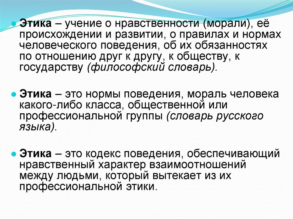 ● Этика – учение о нравственности (морали), еёпроисхождении и развитии, о правилах и нормах