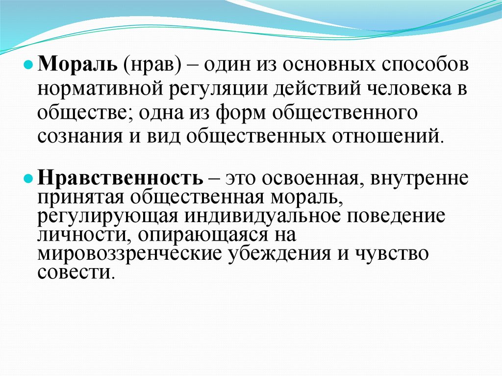 ● Мораль (нрав) – один из основных способовнормативной регуляции действий человека в