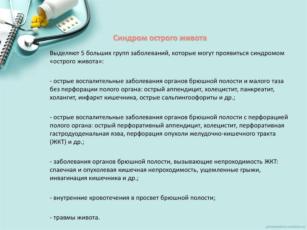 Синдром острого животаВыделяют 5 больших групп заболеваний, которые могут проявиться синдромом