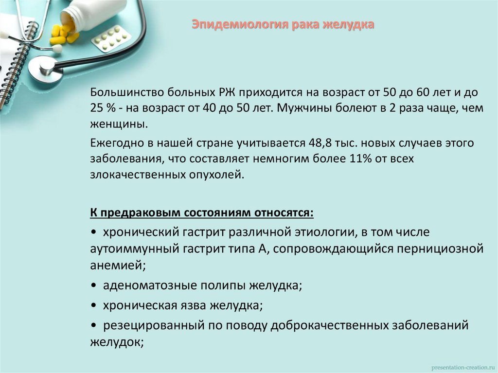 Эпидемиология рака желудкаБольшинство больных РЖ приходится на возраст от 50 до 60 лет и до