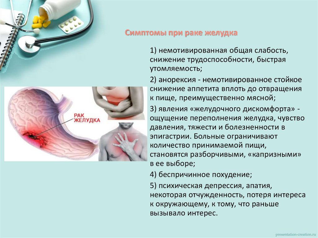 Симптомы при раке желудка1) немотивированная общая слабость,