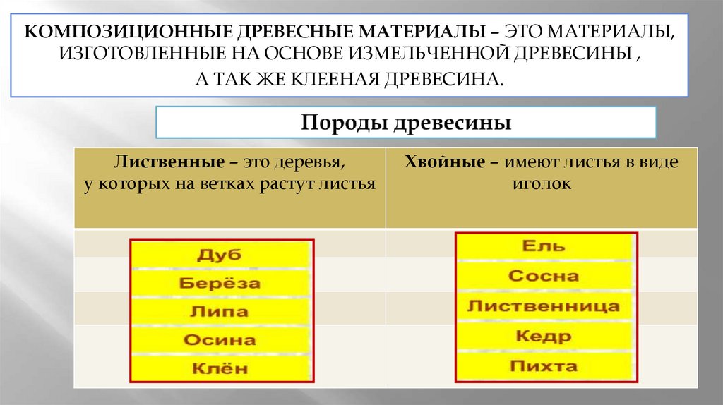 КОМПОЗИЦИОННЫЕ ДРЕВЕСНЫЕ МАТЕРИАЛЫ – ЭТО МАТЕРИАЛЫ,ИЗГОТОВЛЕННЫЕ НА ОСНОВЕ ИЗМЕЛЬЧЕННОЙ ДРЕВЕСИНЫ ,