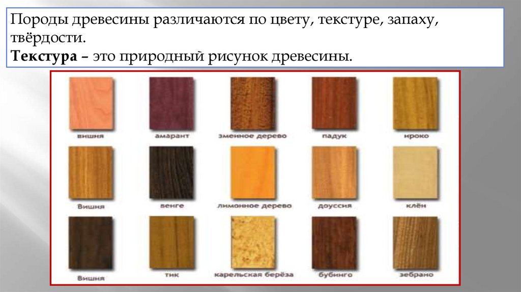 Породы древесины различаются по цвету, текстуре, запаху,твёрдости.