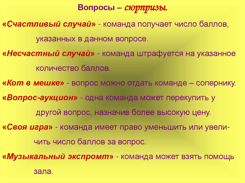 Вопросы – сюрпризы.«Счастливый случай» - команда получает число баллов,