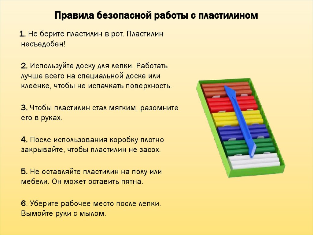 Правила безопасной работы с пластилином1. Не берите пластилин в рот. Пластилин
