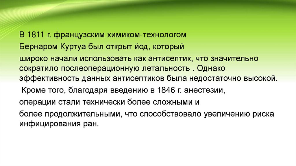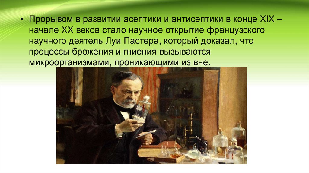 • Прорывом в развитии асептики и антисептики в конце XIX –начале XX веков стало научное открытие французского