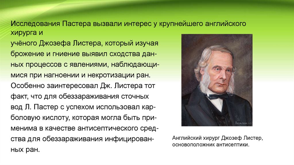 вод Л. Пастер с успехом использовал карболовую кислоту, которая могла быть применима в качестве антисептического средАнглийский хирург Джозеф Листер,